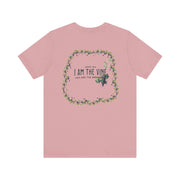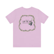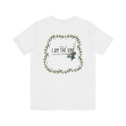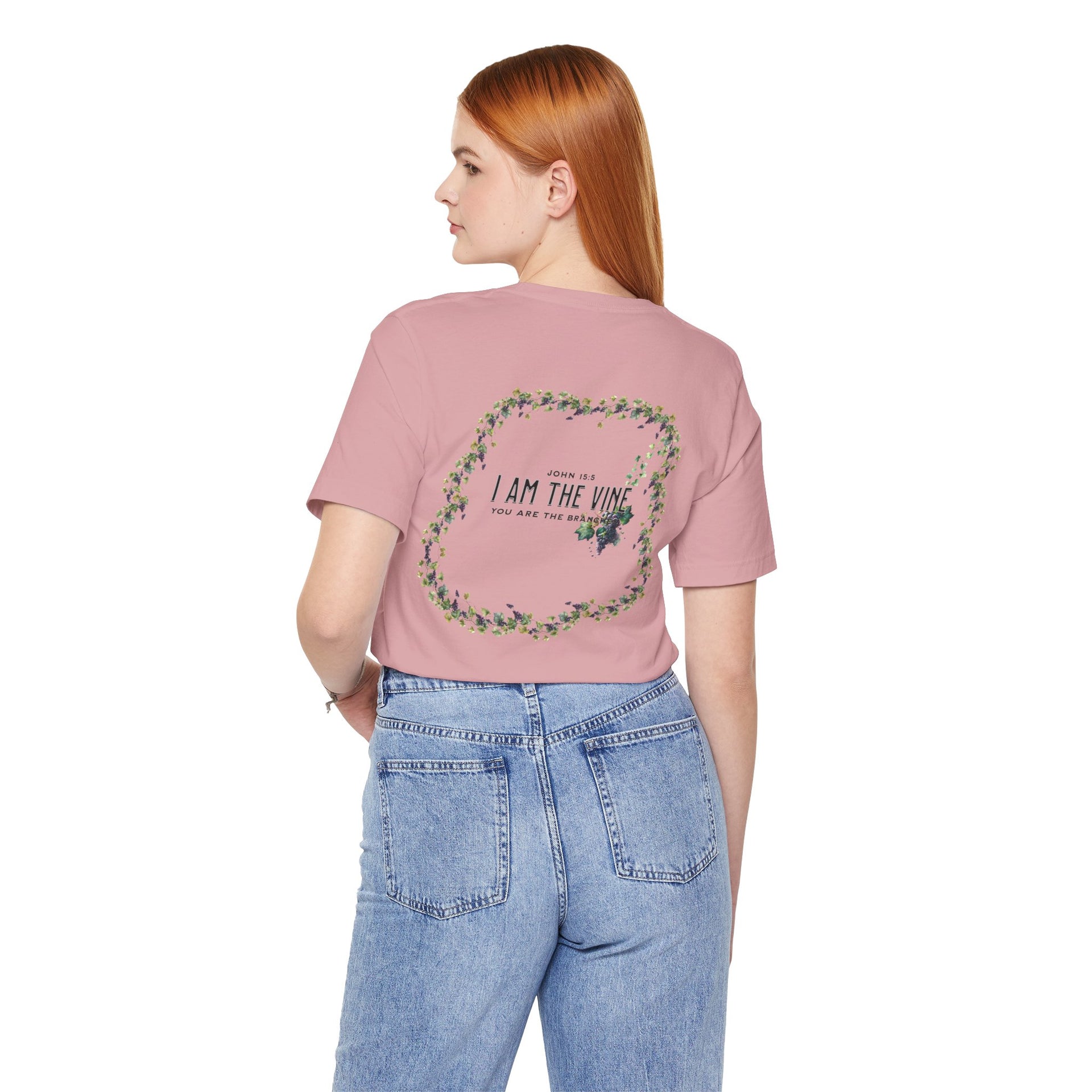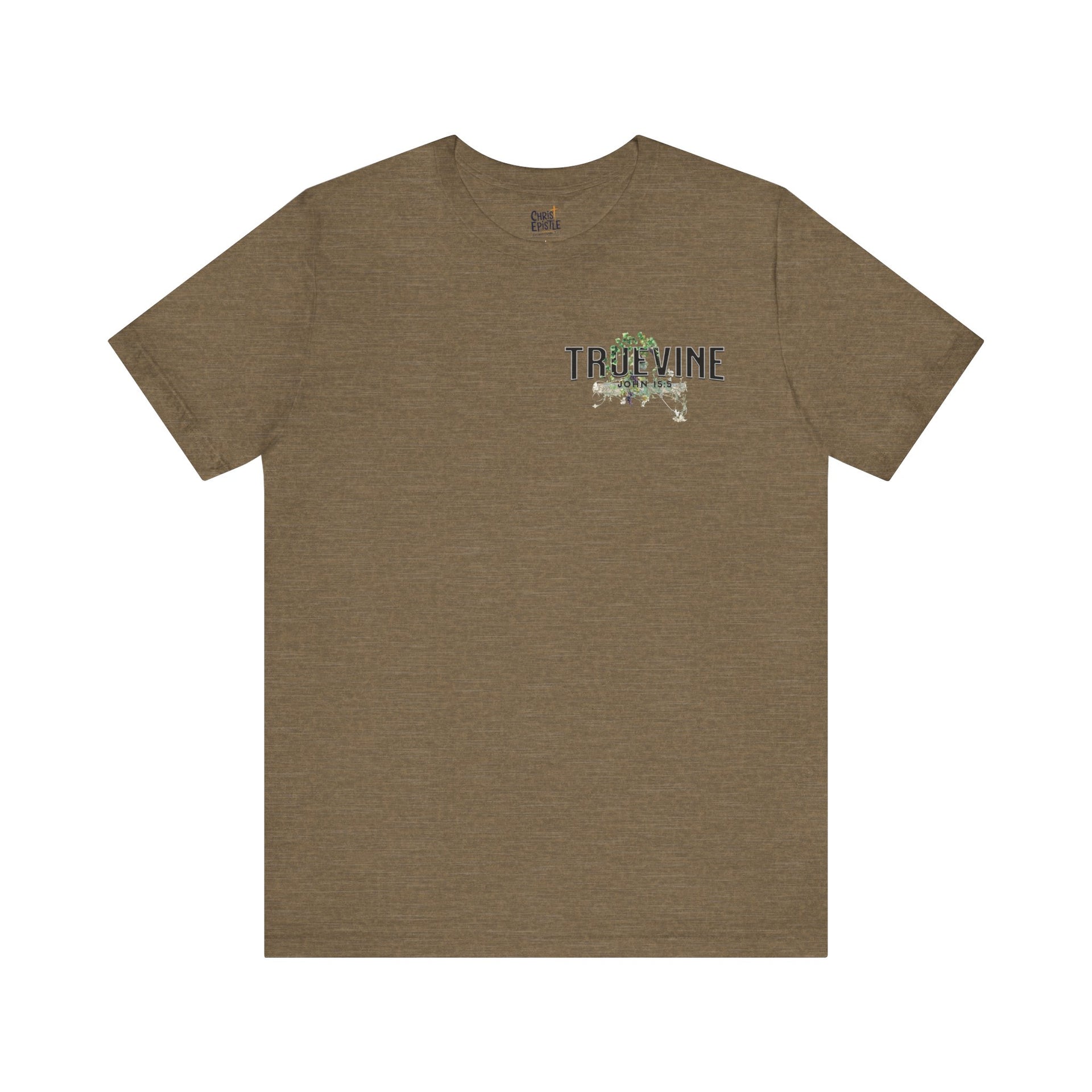 A true vine t-shirt featuring scripture John 15:5, symbolizing our connection to Jesus Christ. This t-shirt exudes a spiritual and uplifting vibe, perfect for those seeking faith-inspired clothing. Ideal for Christian holidays, church gatherings, and everyday wear for believers.