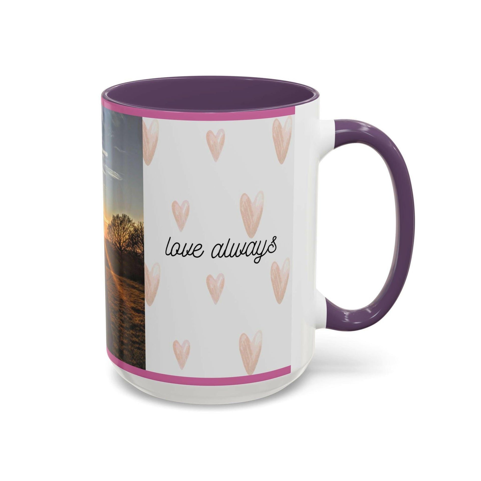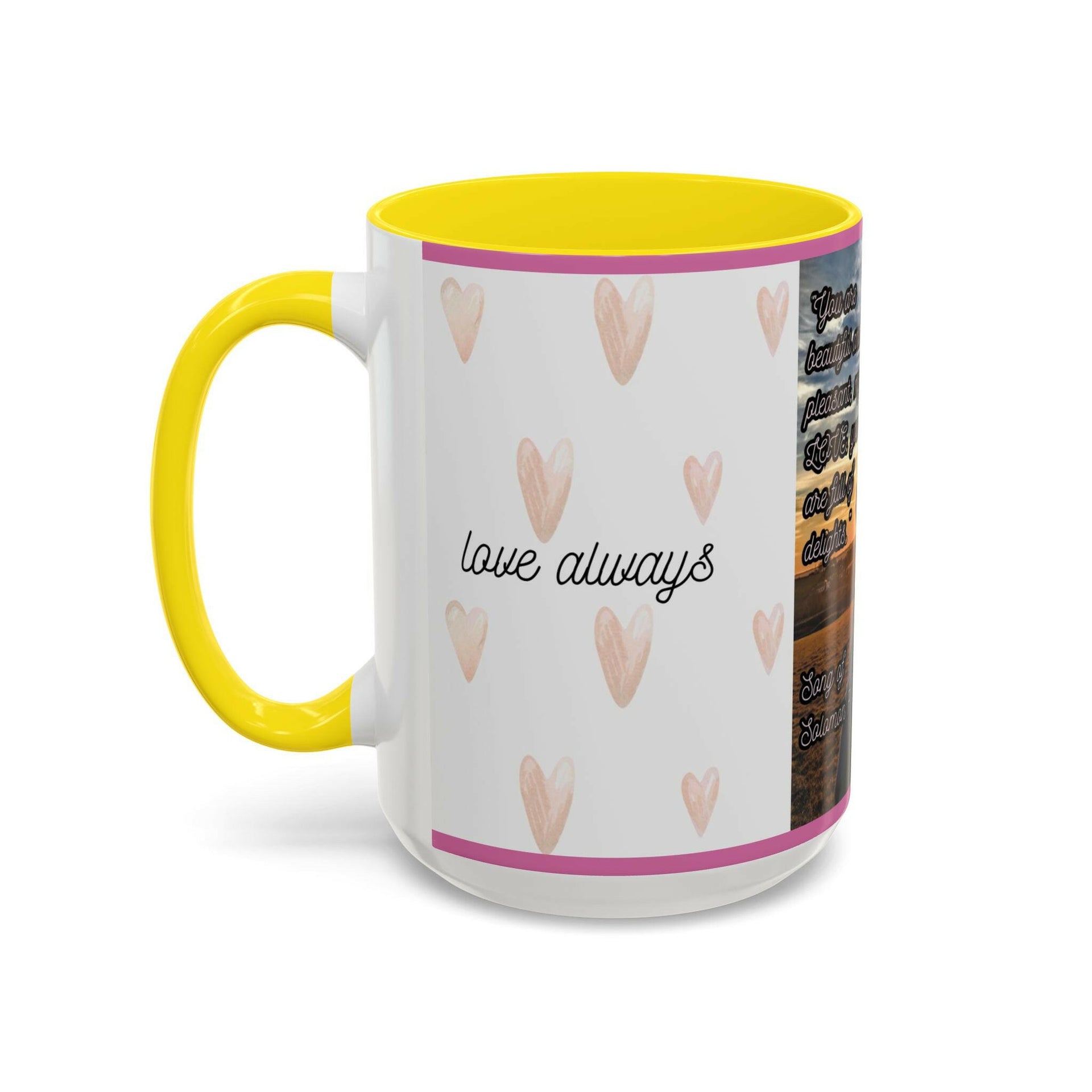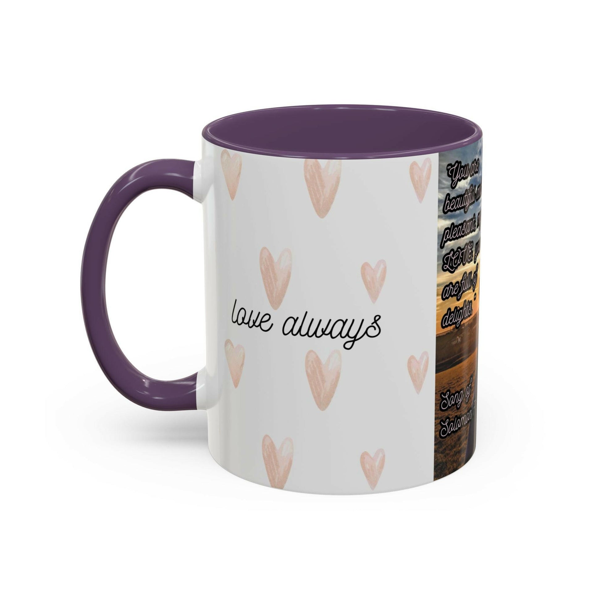 Start your day with inspiration and love with our "Love Hands & Heart" Accent Mug. Featuring a stunning sunset backdrop with hands forming a heart, this mug is beautifully adorned with the timeless words from Songs of Solomon 7:6: "You are beautiful and pleasant, my love; you delight me." Whether you're sipping your morning coffee, enjoying an afternoon tea, or relaxing with an evening hot cocoa, this mug is a daily reminder of God’s love and the beauty of cherished relationships. Perfect gift for Valentine's Day and Anniversaries! Product Details: