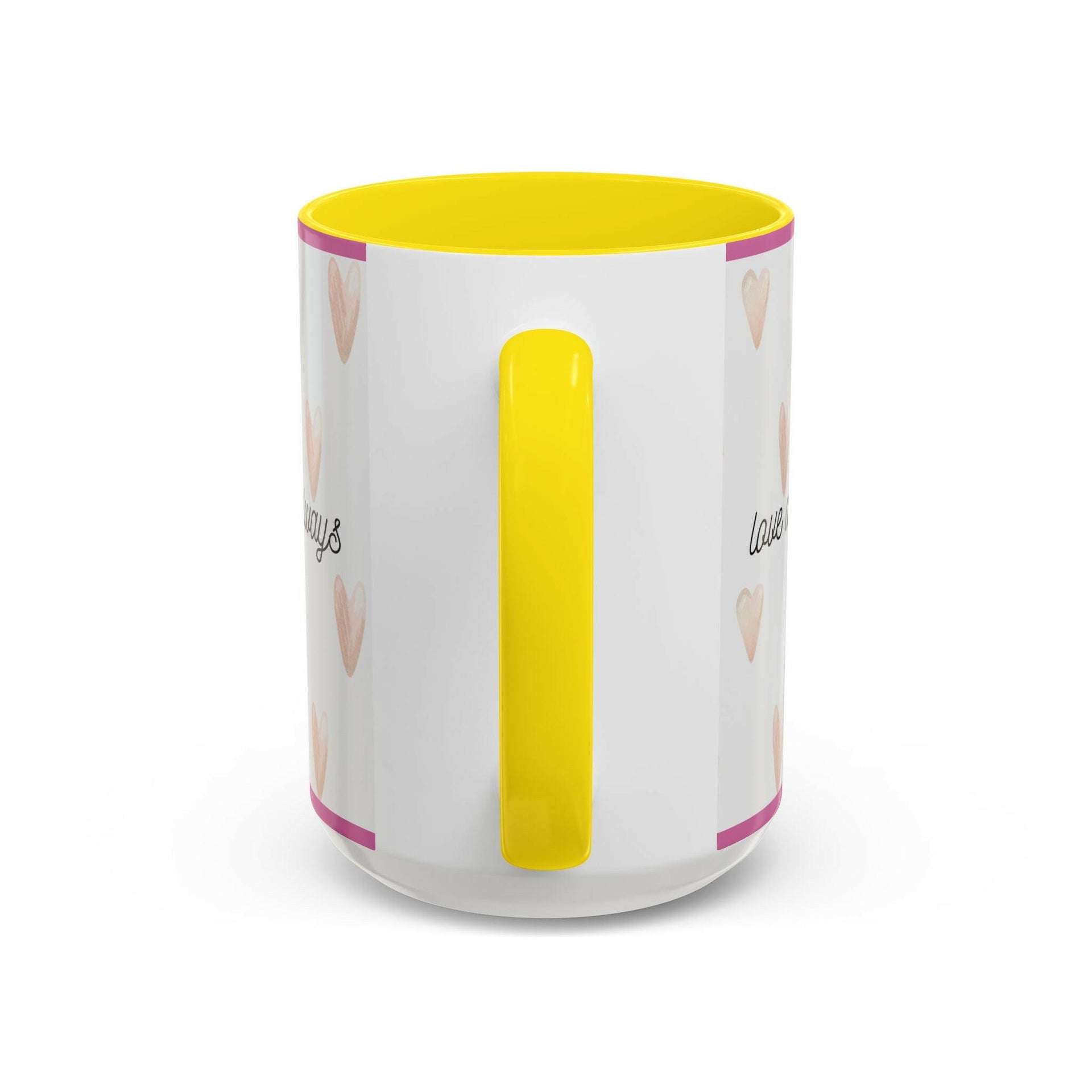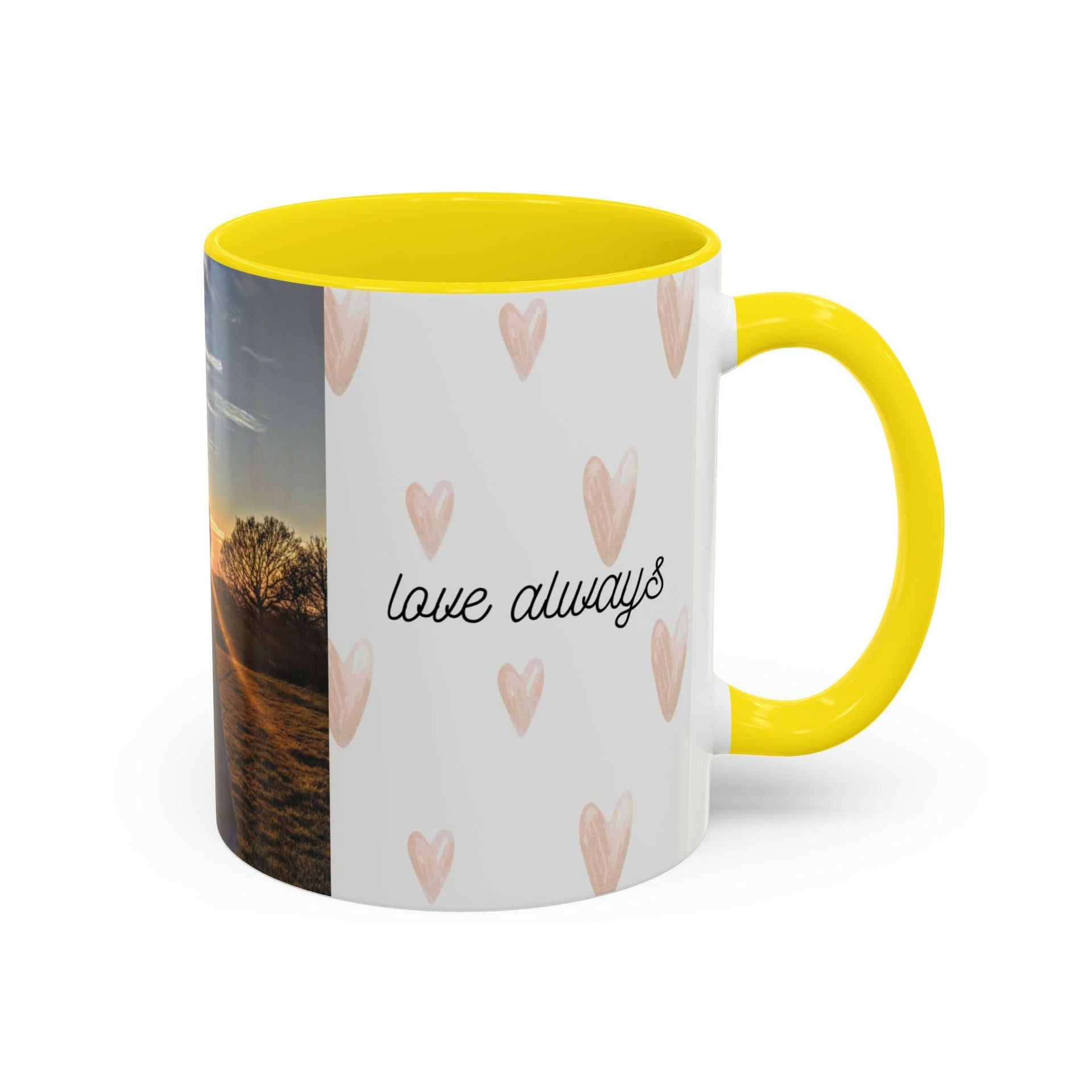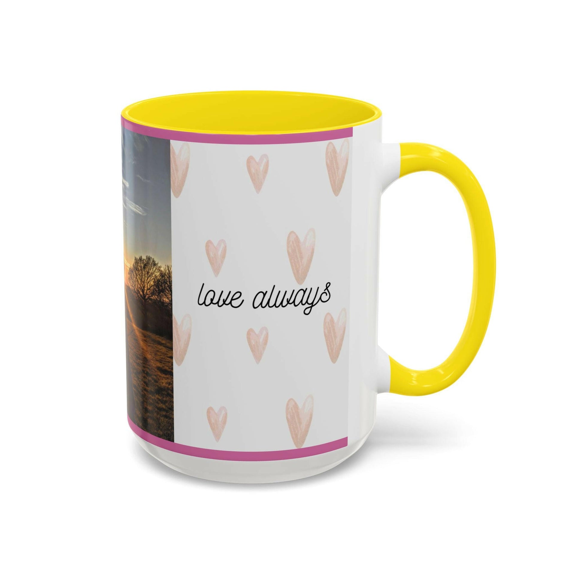 Material: High-quality ceramic Capacity: Available in 11oz or 15oz sizes Design: Vibrant, full-wrap print with contrasting color accents on the handle and interior (choose from multiple accent colors)