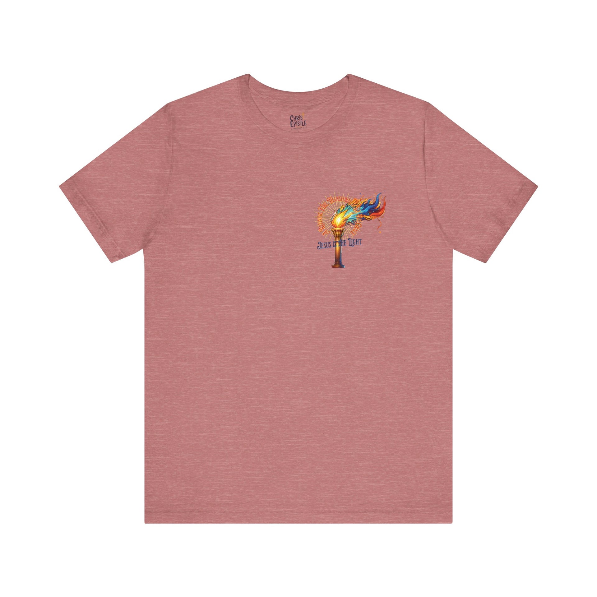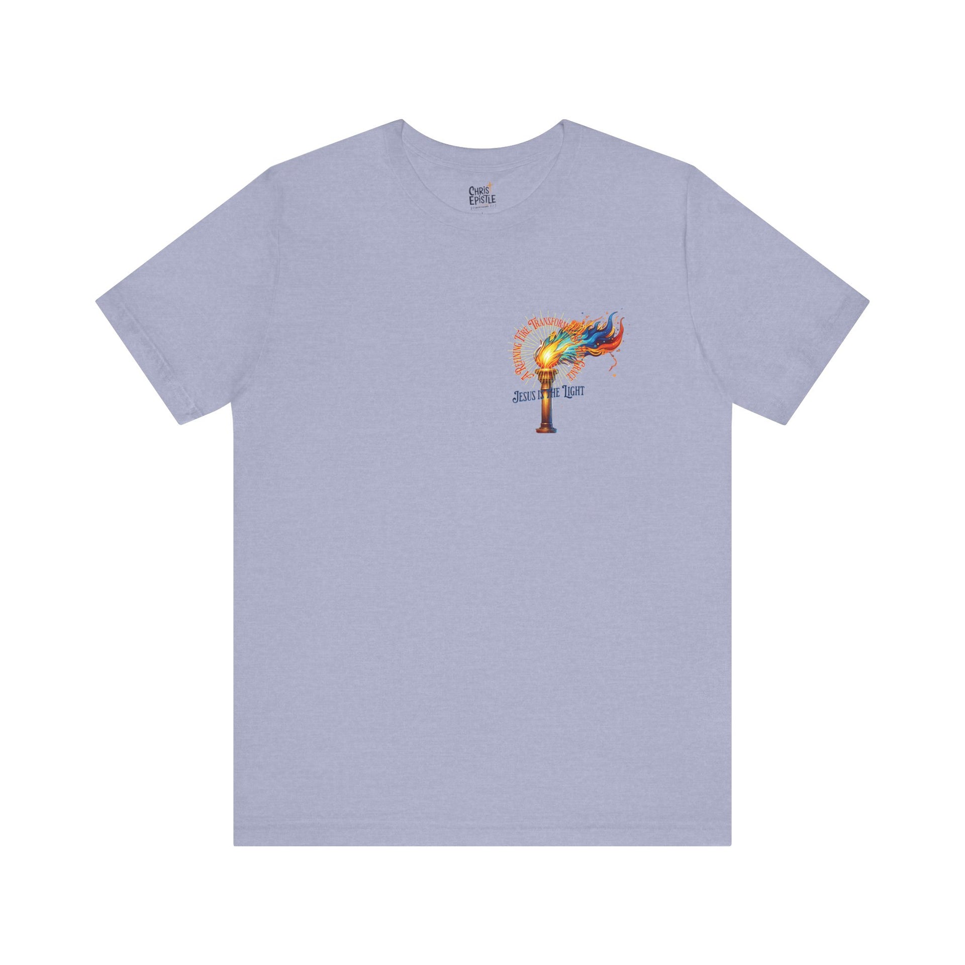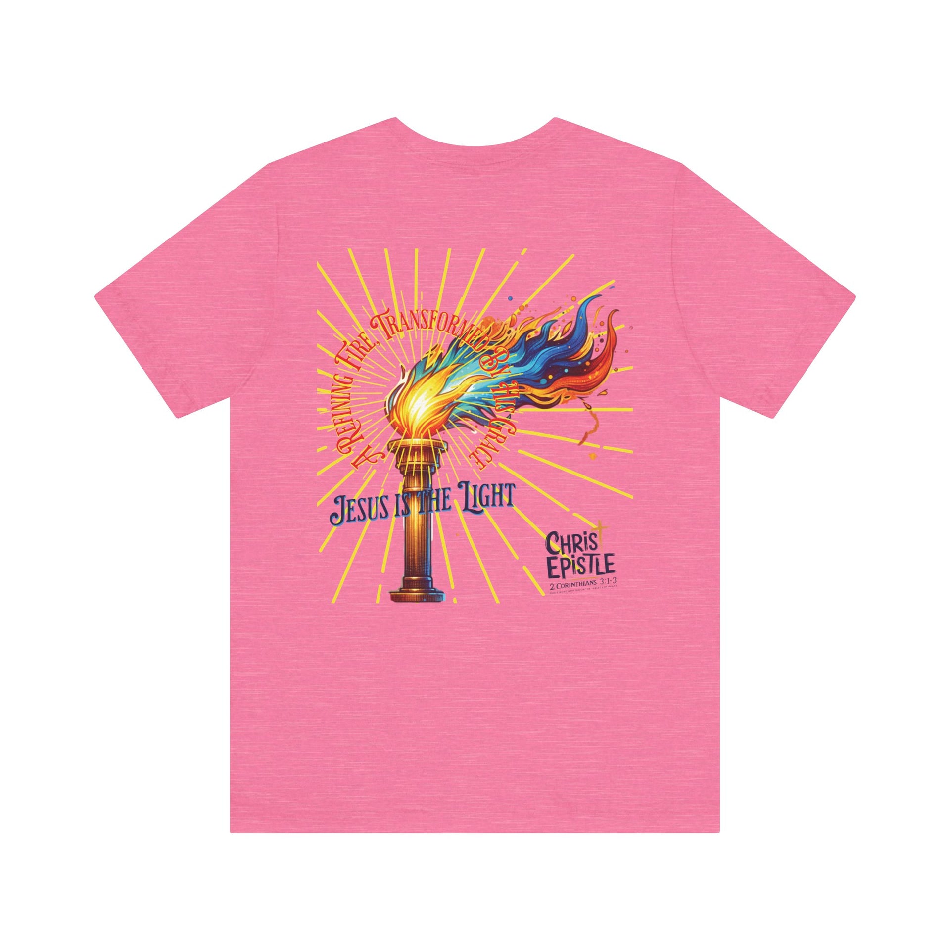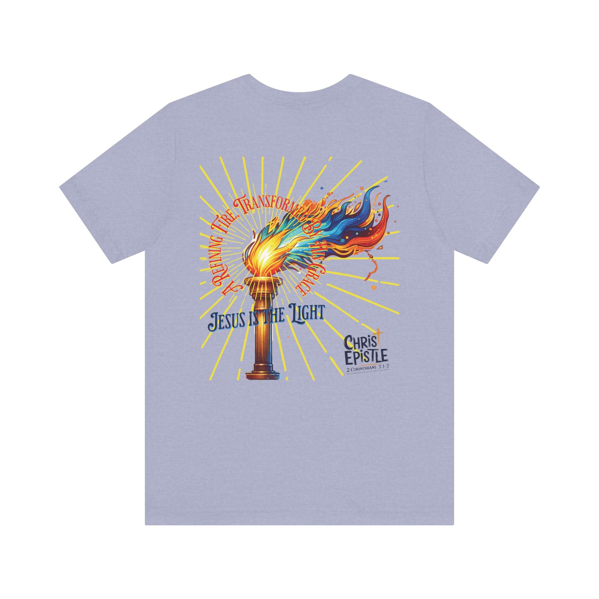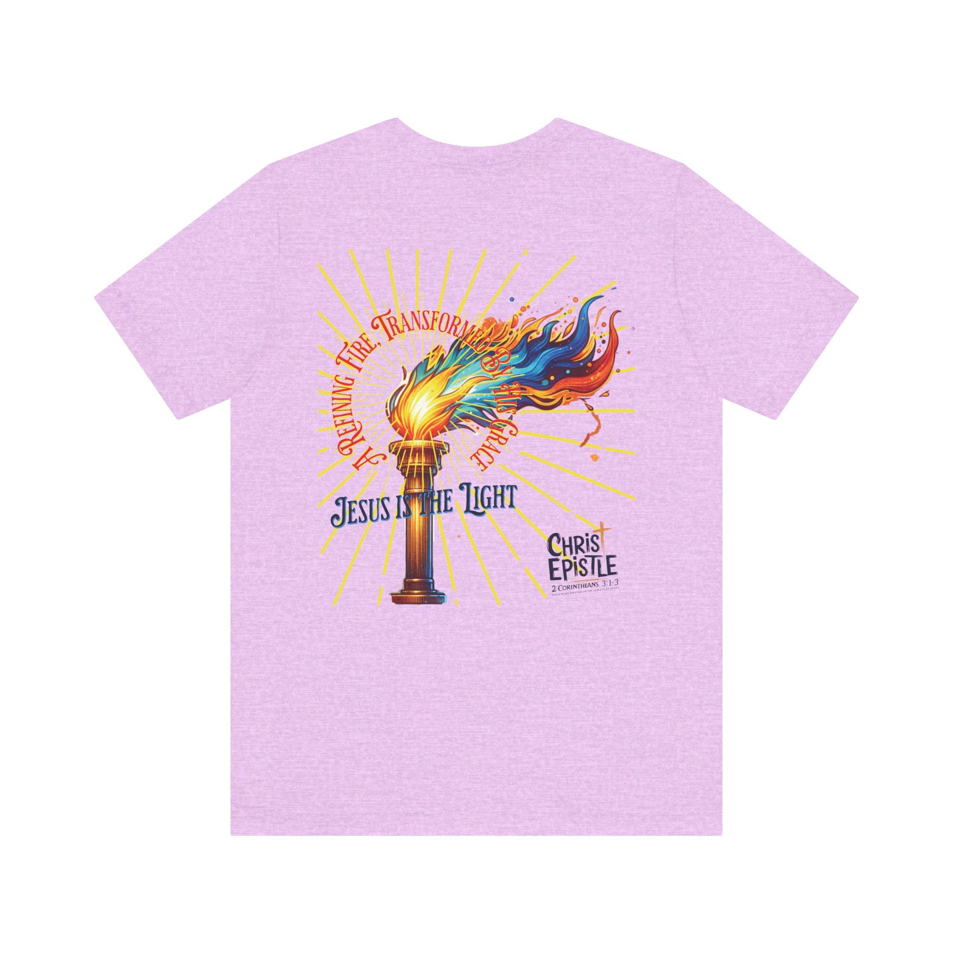 Shine your faith boldly with this inspiring women's t-shirt! Featuring a vibrant torch design symbolizing the "Refining Fire" of transformation, the illustration radiates colorful flames surrounded by sunbeams. The powerful message, "Jesus Is the Light," takes center stage, making it a perfect reminder of faith's illuminating power. Crafted for comfort and style, this t-shirt is made from premium soft cotton and designed with a classic fit that complements every wardrobe. Whether for church, outreach events, or everyday wear, this tee is a meaningful statement of faith and light.