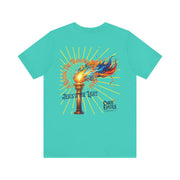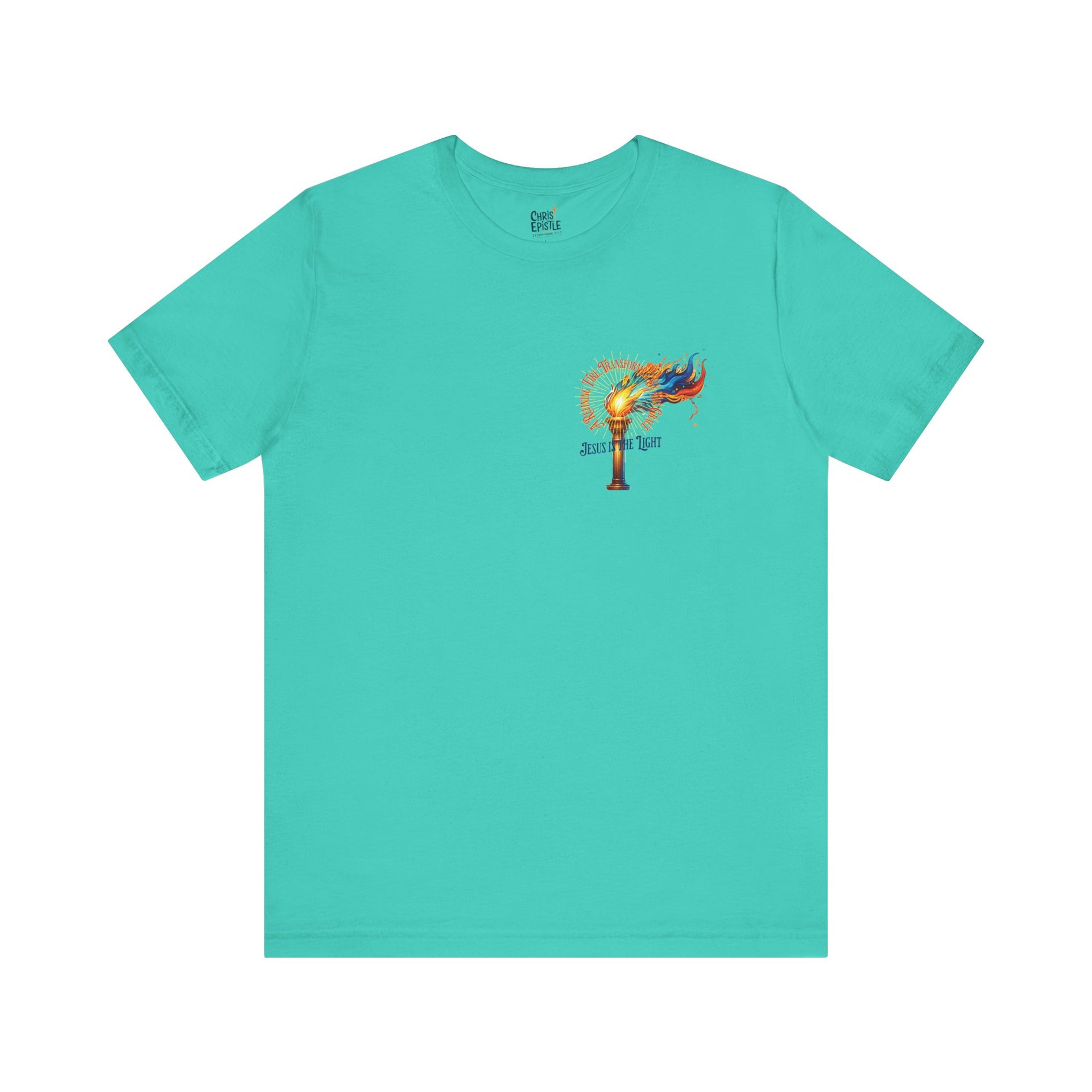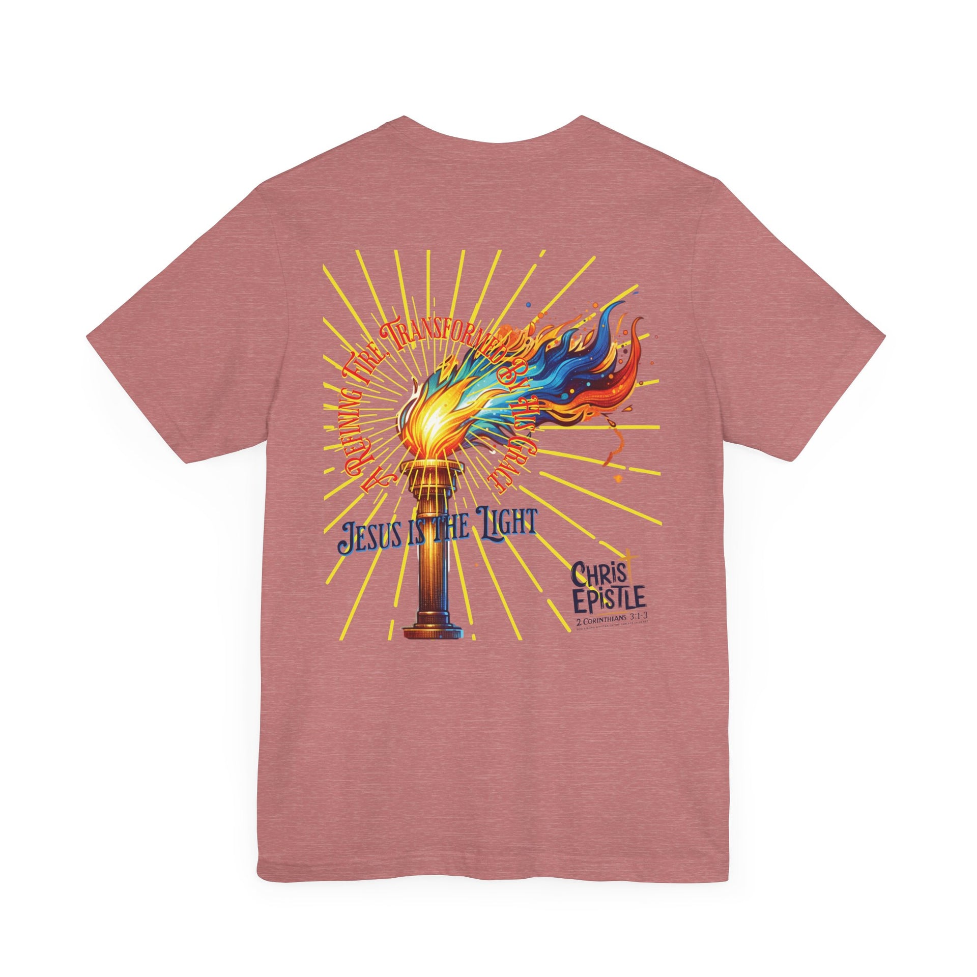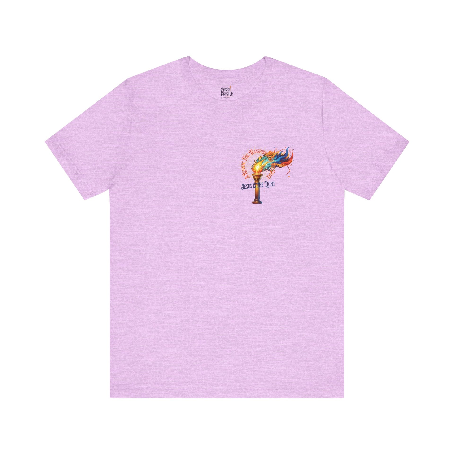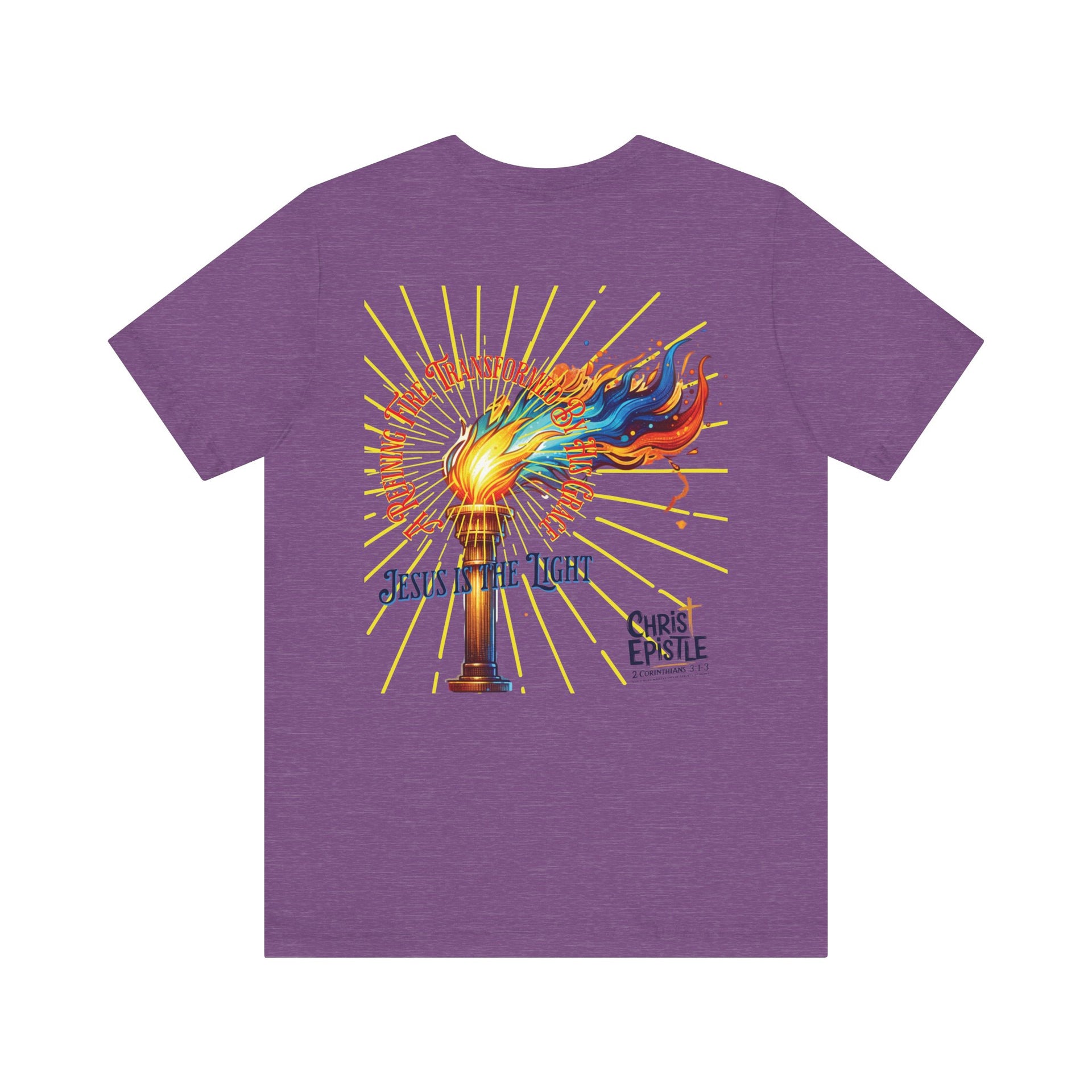 Shine your faith boldly with this inspiring women's t-shirt! Featuring a vibrant torch design symbolizing the "Refining Fire" of transformation, the illustration radiates colorful flames surrounded by sunbeams. The powerful message, "Jesus Is the Light," takes center stage, making it a perfect reminder of faith's illuminating power. Crafted for comfort and style, this t-shirt is made from premium soft cotton and designed with a classic fit that complements every wardrobe. Whether for church, outreach events, or everyday wear, this tee is a meaningful statement of faith and light.